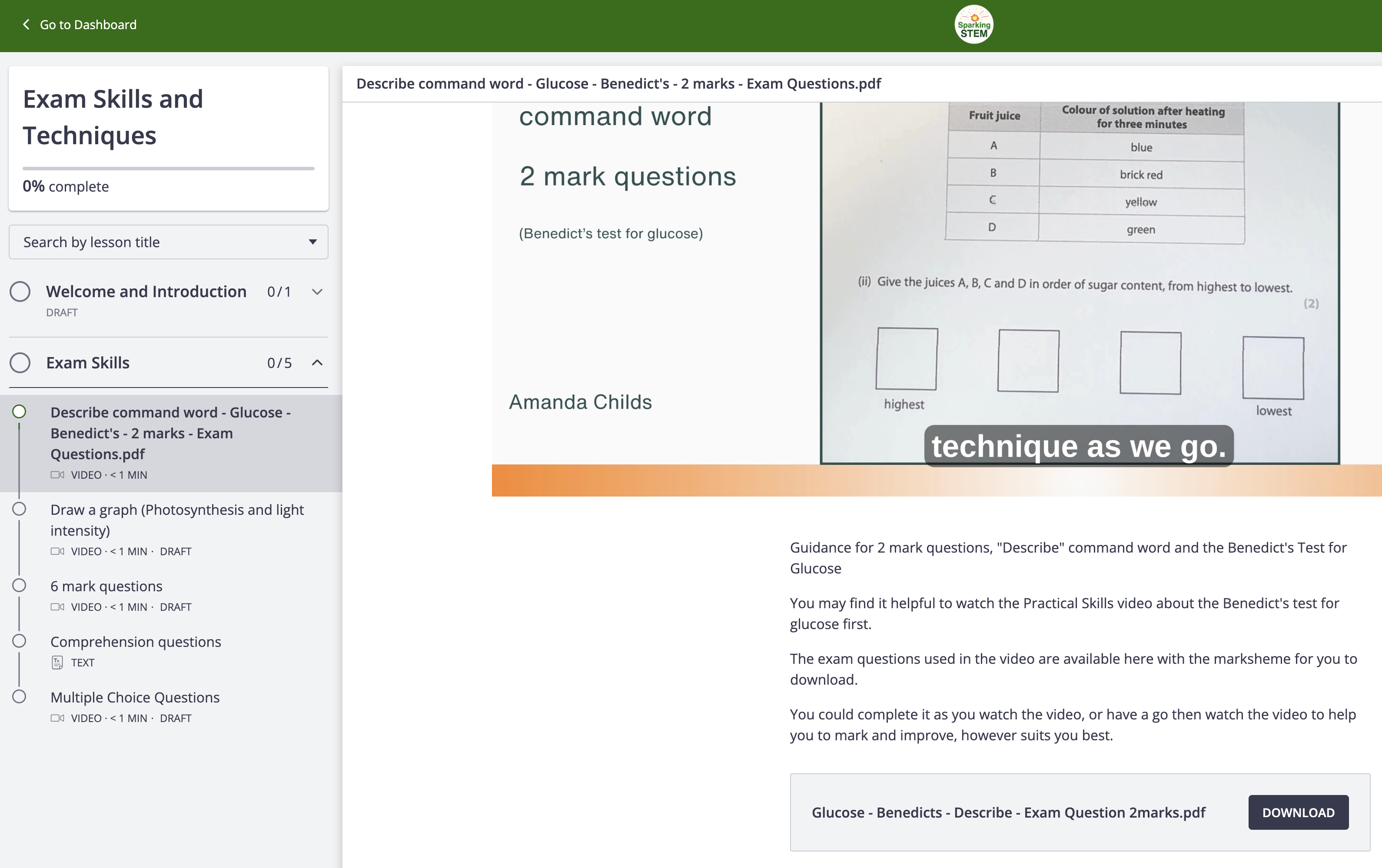 A downloadable PDF provides the exam question(s) and mark scheme(s) shown in the video. Students can practice, apply or test themselves.